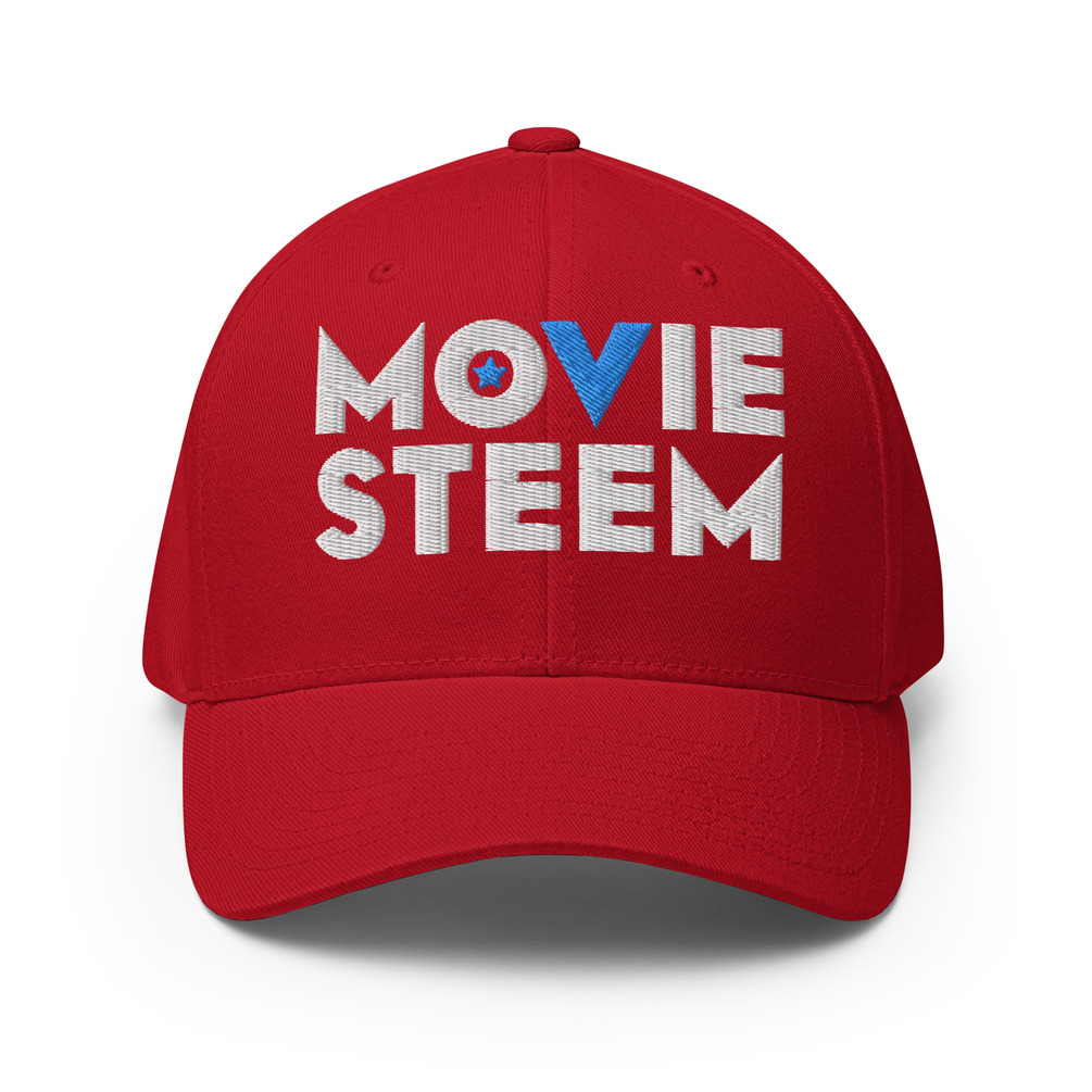 The Moviesteem Director Rouge Brand Flexfit Cap structured cap has a sturdy body, a curved visor, and a silver underside. It comes in two sizes and has an elastic band for maximum stretch and comfort.